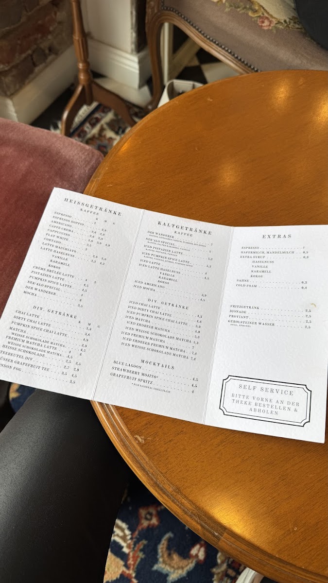 The menu offers a selection of beverages and light food items suitable for coffee breaks and casual dining throughout the day. Available options primarily include various types of coffee and other drinks, complemented by cakes and waffles as sweet treats. This makes the menu appropriate for quick orders or relaxed consumption during work or meetings.